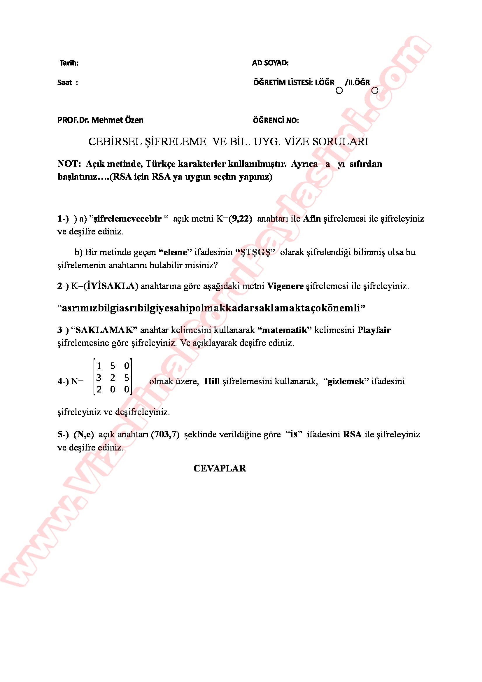 Cebirsel Şifreleme Ve Bilgisayar Uygulamaları Vize Soruları Ve Cevapları