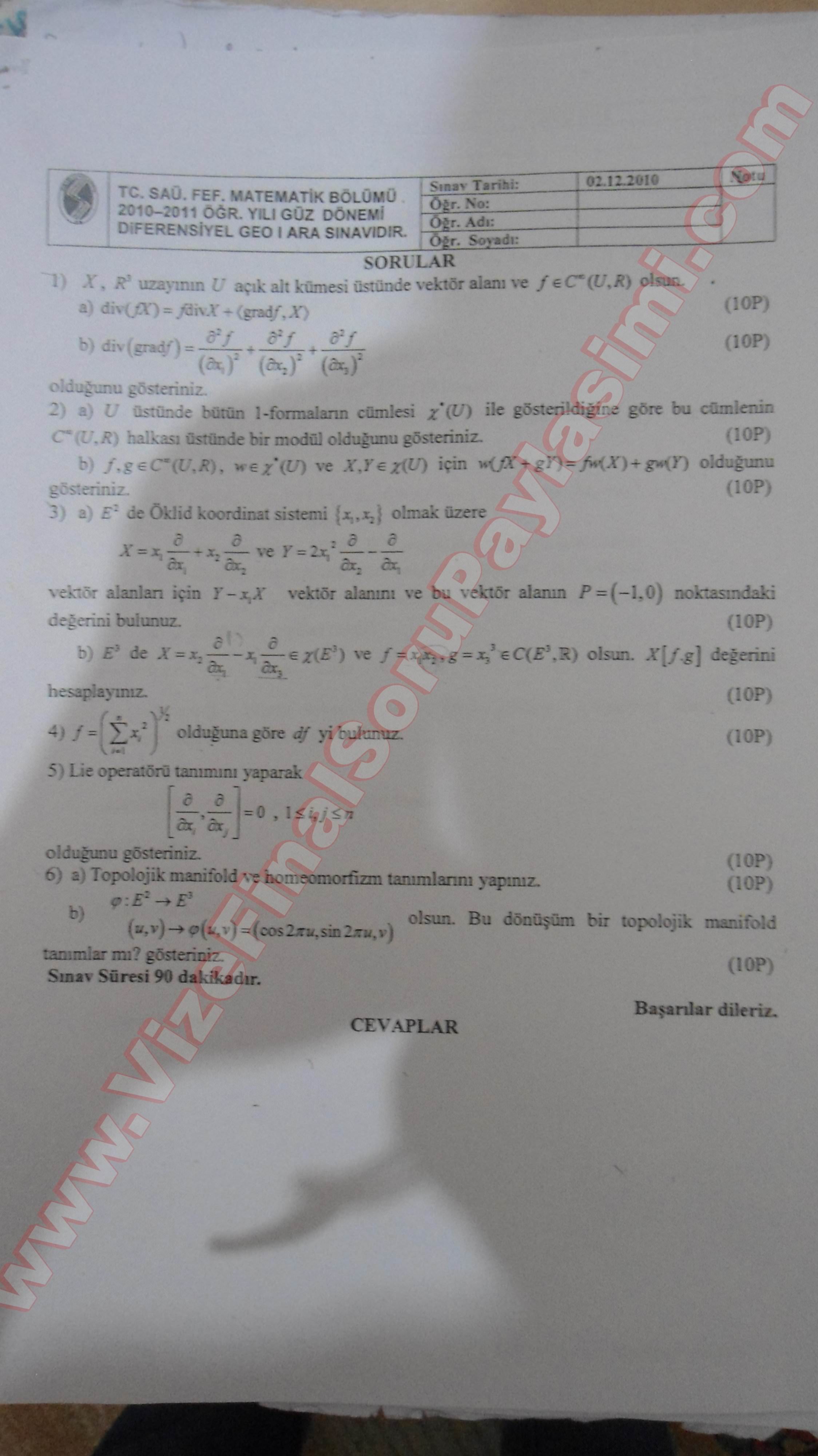 Vize ve Final Soruları / Sakarya Üniversitesi / Diferansiyel Geometri -1