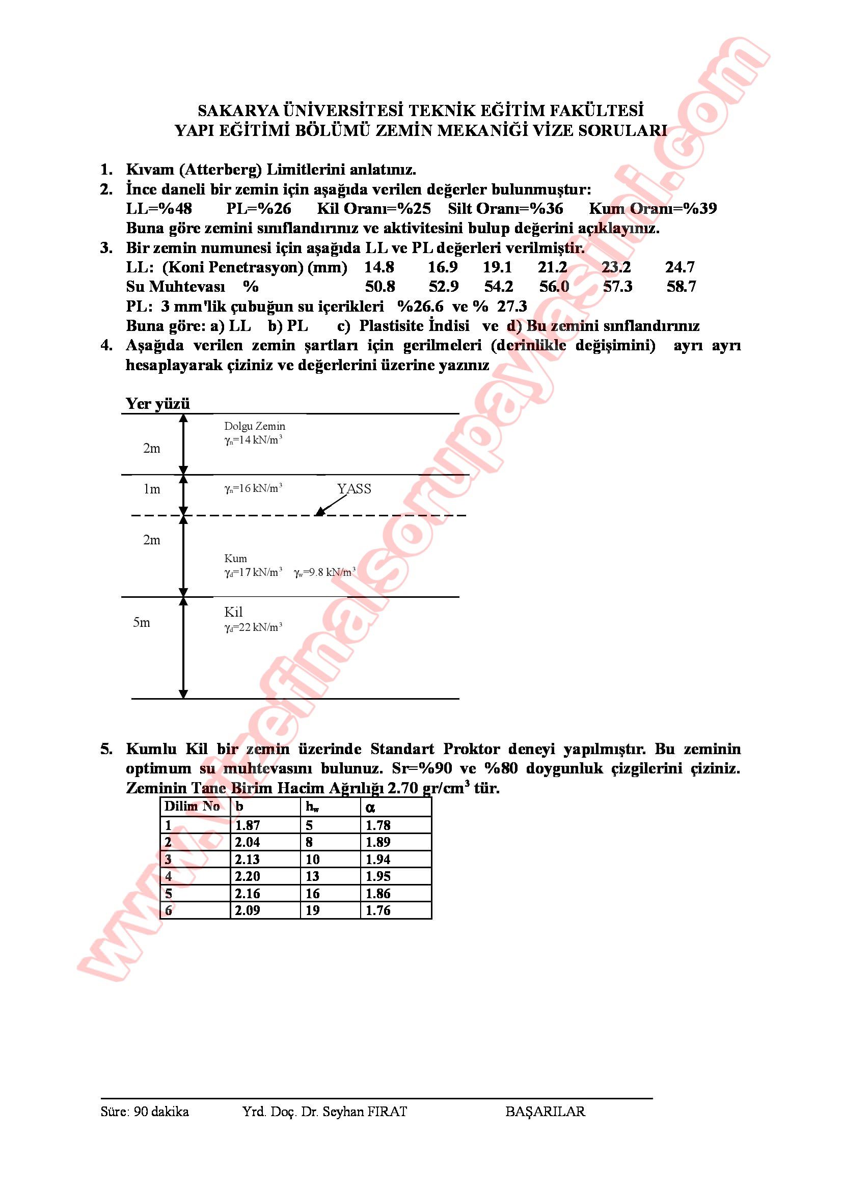 Vize ve Final Soruları / Sakarya Üniversitesi / Zemin Mekaniği Dersi