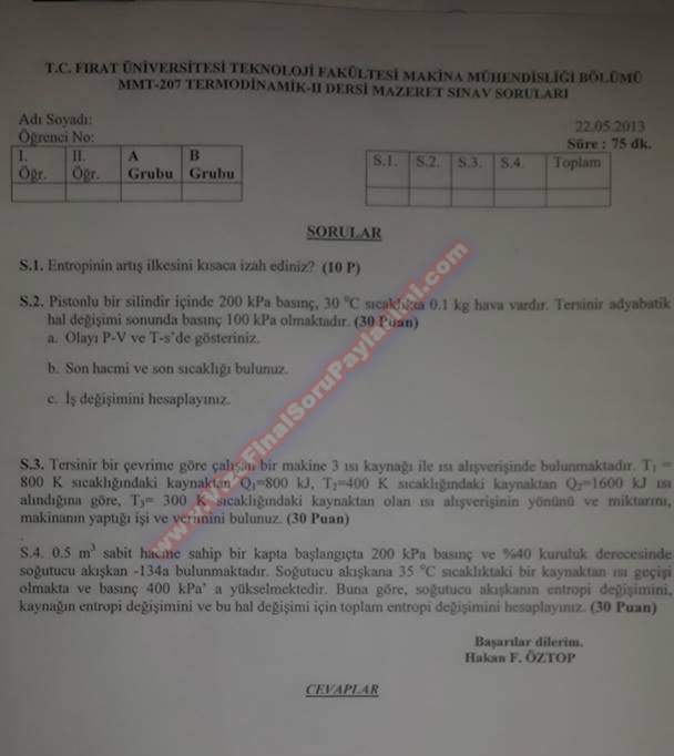 Vize ve Final Soruları / Fırat Üniversitesi / Termodinamik-2