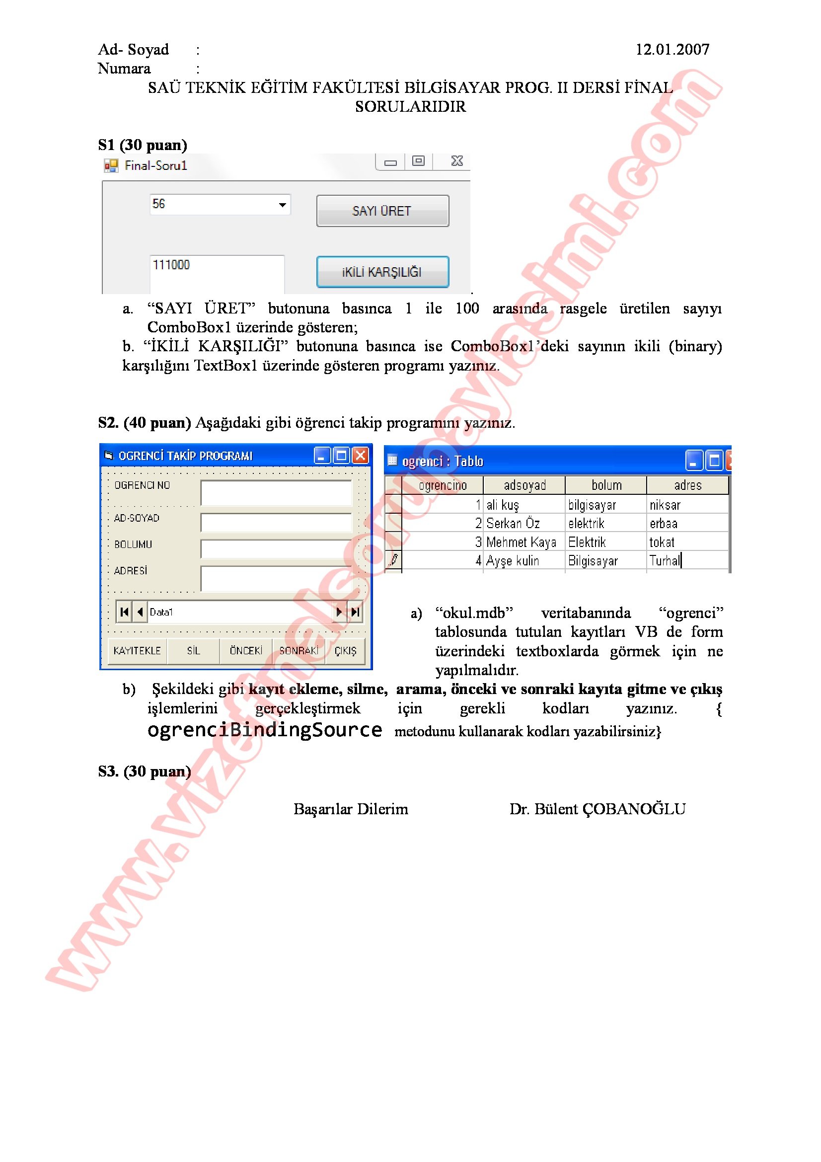Vize ve Final Soruları / Sakarya Üniversitesi / Bilgisayar Programlama -2
