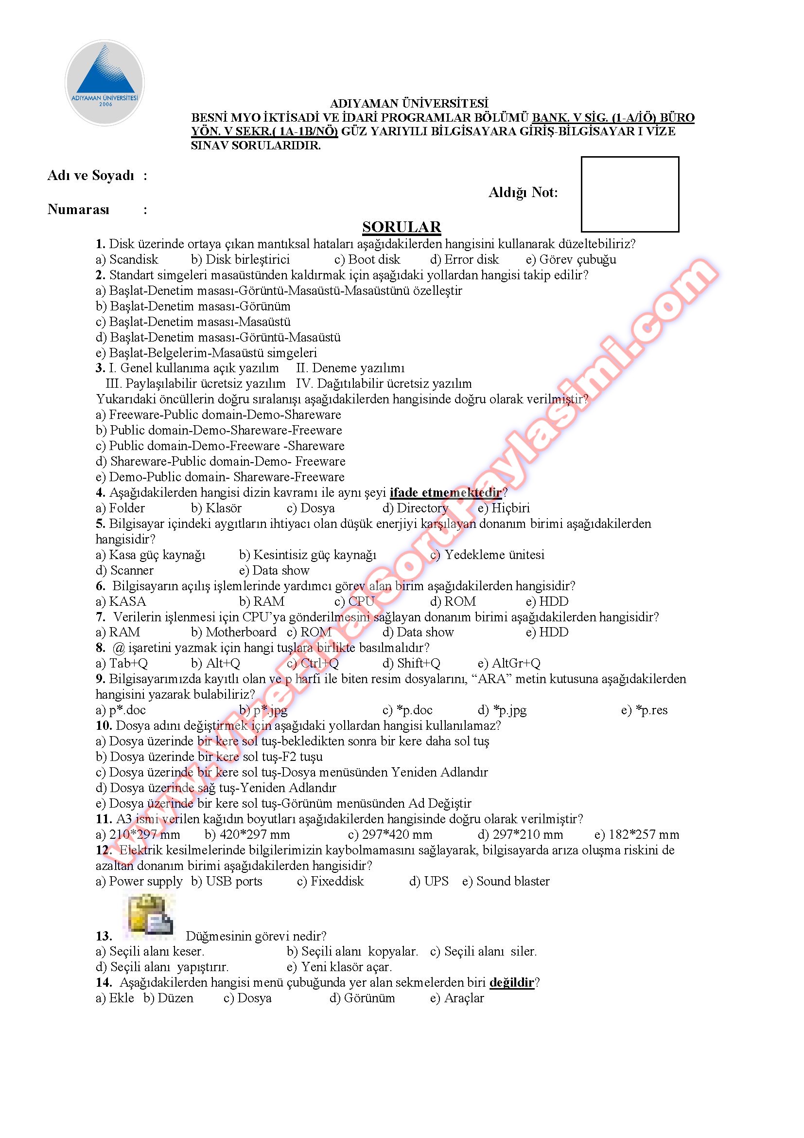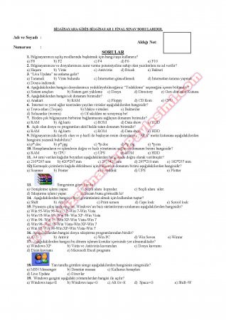 Vize ve Final Soruları / Adıyaman Üniversitesi / Bilgisayara Giriş Dersi