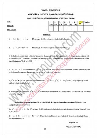 Tunceli Üniversitesi Mühendislik Matematiği Diferansiyel Denklemler Final Soruları 21-07-2014, 02:10