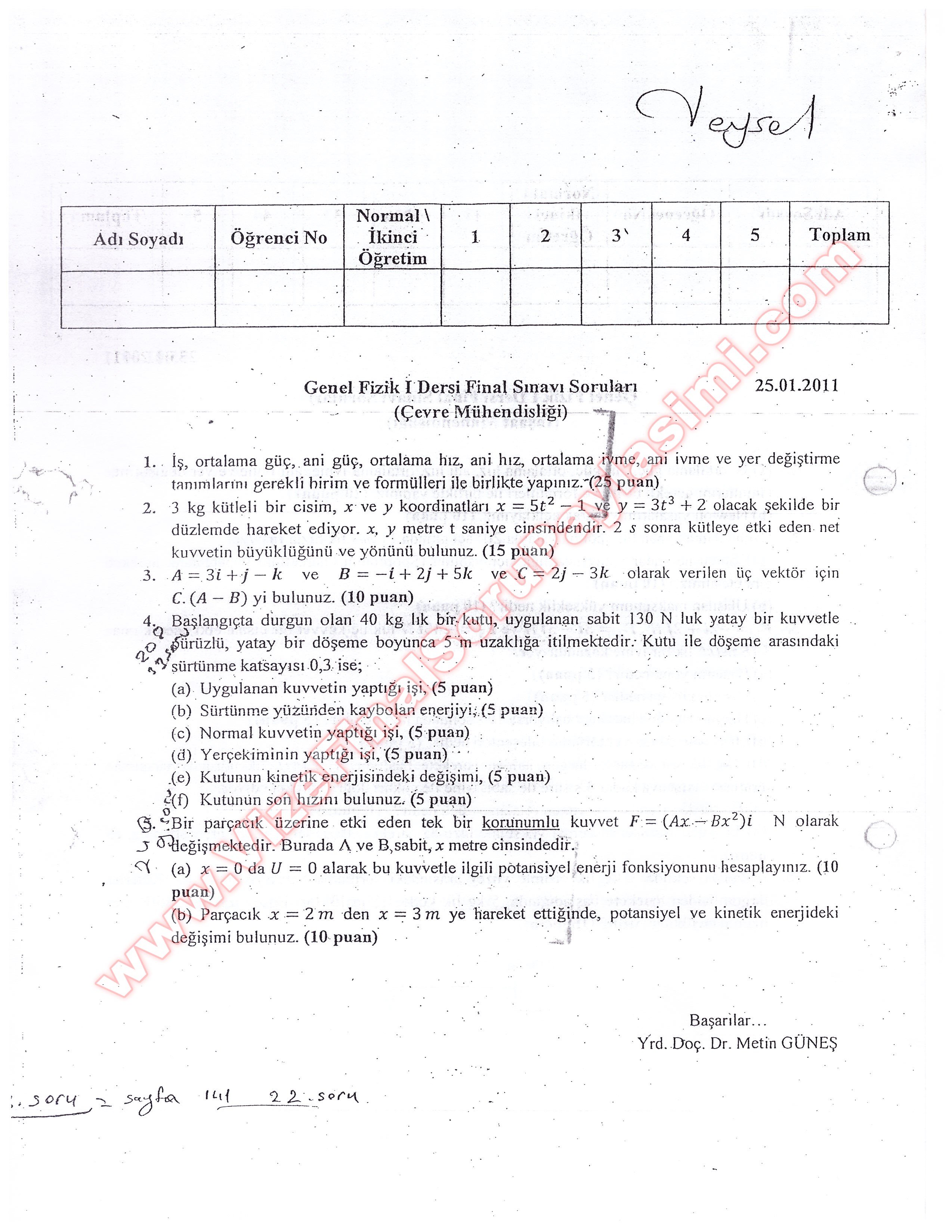 Genel Fizik 1 Vize Sınav Soruları Gece 2011 26-03-2015, 05:54
