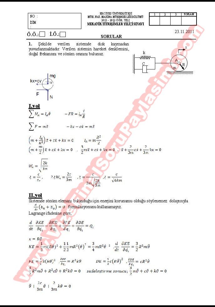 Vize ve Final Soruları / Erciyes Üniversitesi / Mekanik Titreşimler Dersi
