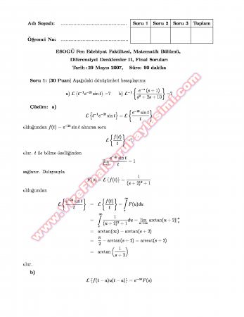 Eskişehir Osmangazi Üniversitesi Diferansiyel Denklemler - 2007 Soruları 18-07-2014, 01:57