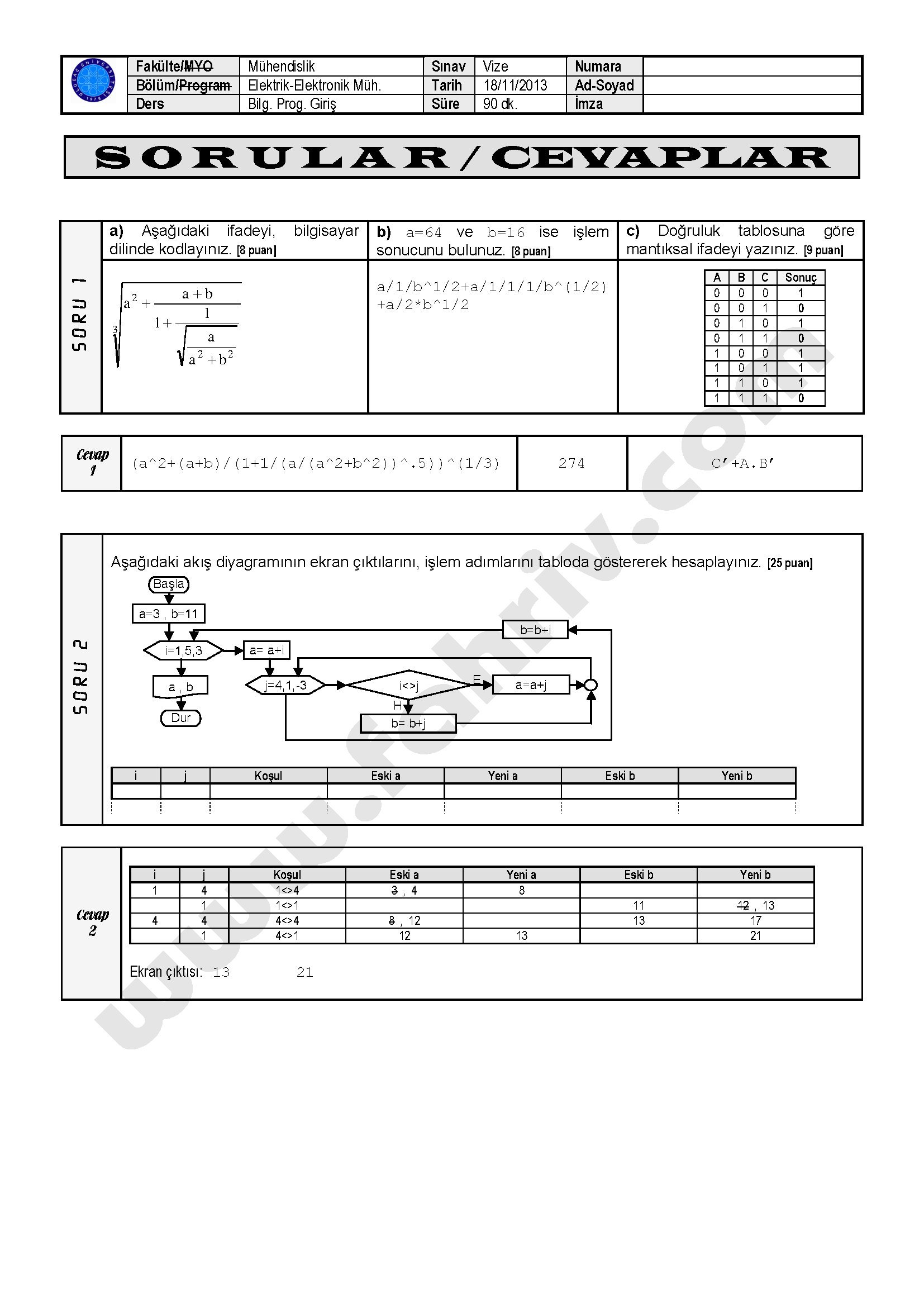 Bilgisayar Programlama Giriş Vize Soruları - 18.11.2013