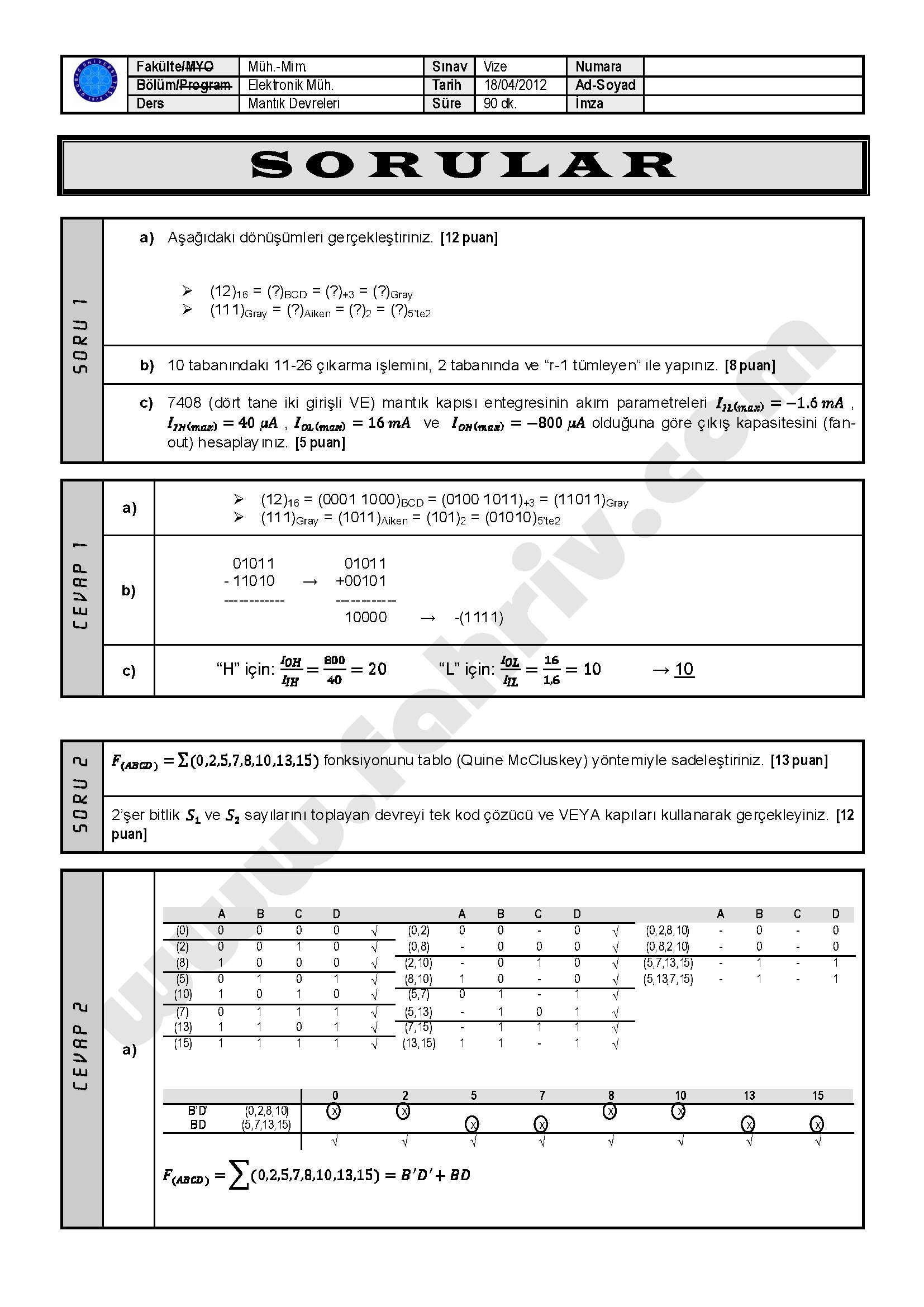 Mantık Devreleri Vize Soruları Ve Cevapları - 18.04.2012