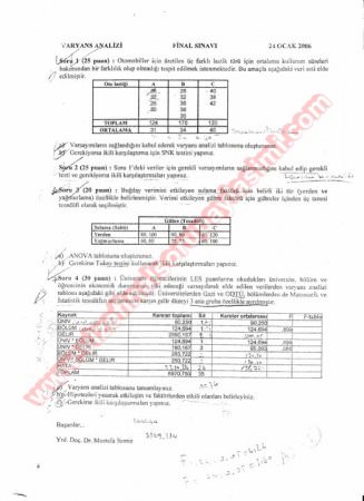 Kategori: Vize ve Final Soruları / Selçuk Üniversitesi / Varyans Analizi