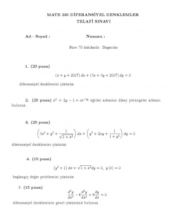 Anahtar Kelimeler: Diferansiyel Denklemler Dersi Telafi Sınavı Soruları Fatih Üniversitesi