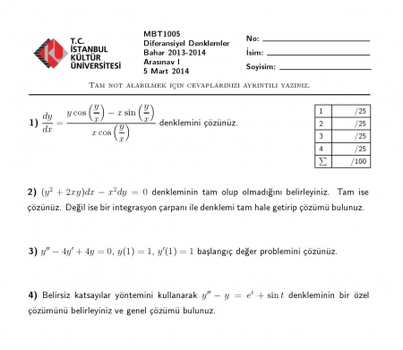 Anahtar Kelimeler: İstanbul Kültür Üniversitesi Diferansiyel Denklemler Dersi Vize Soruları