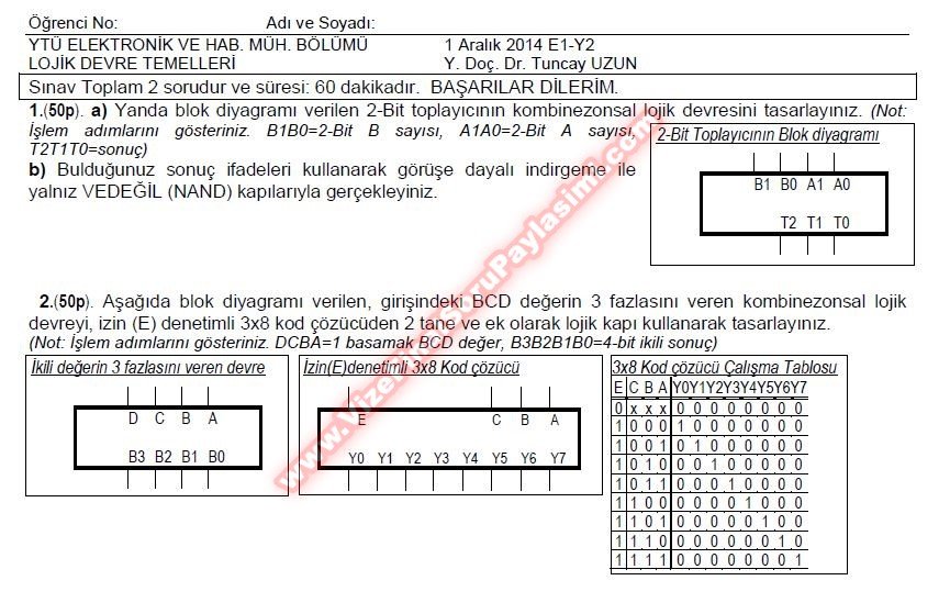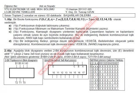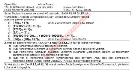 Vize ve Final Soruları / Yıldız Teknik Üniversitesi / Lojik Devre Temelleri Dersi
