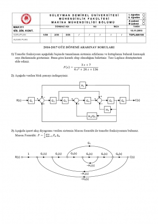 Anahtar Kelimeler: Sistem Dinamiği ve Kontrol Dersi vize soruları Vize Soruları ve Cevapları Süleyman Demirel Üniversitesi SDÜ 2016