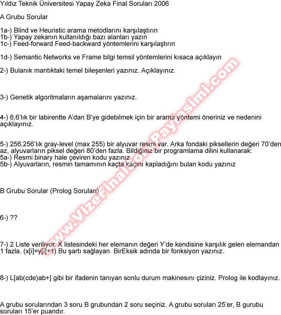 Vize ve Final Soruları / Yıldız Teknik Üniversitesi / Yapay Zeka Dersi