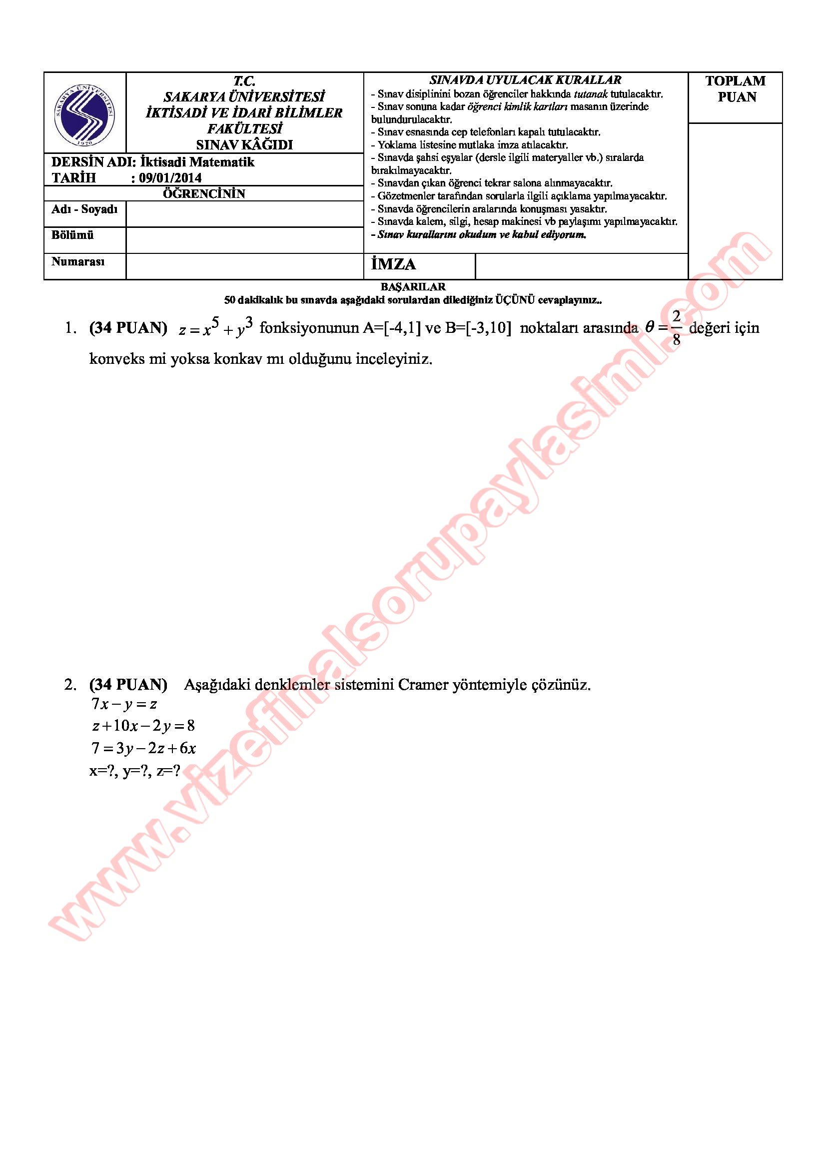 İktisadi Matematik Final Soruları - 09.01.2014