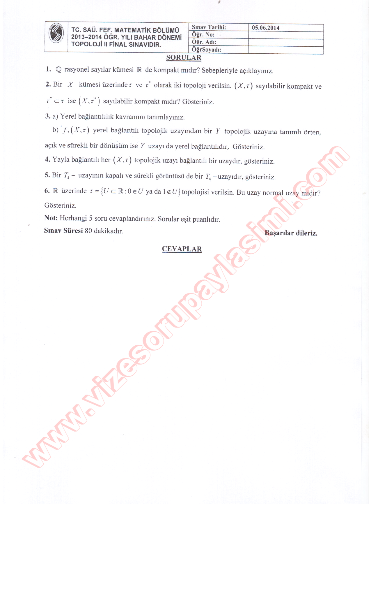 Topoloji-2 Final Soruları Ve Cevapları