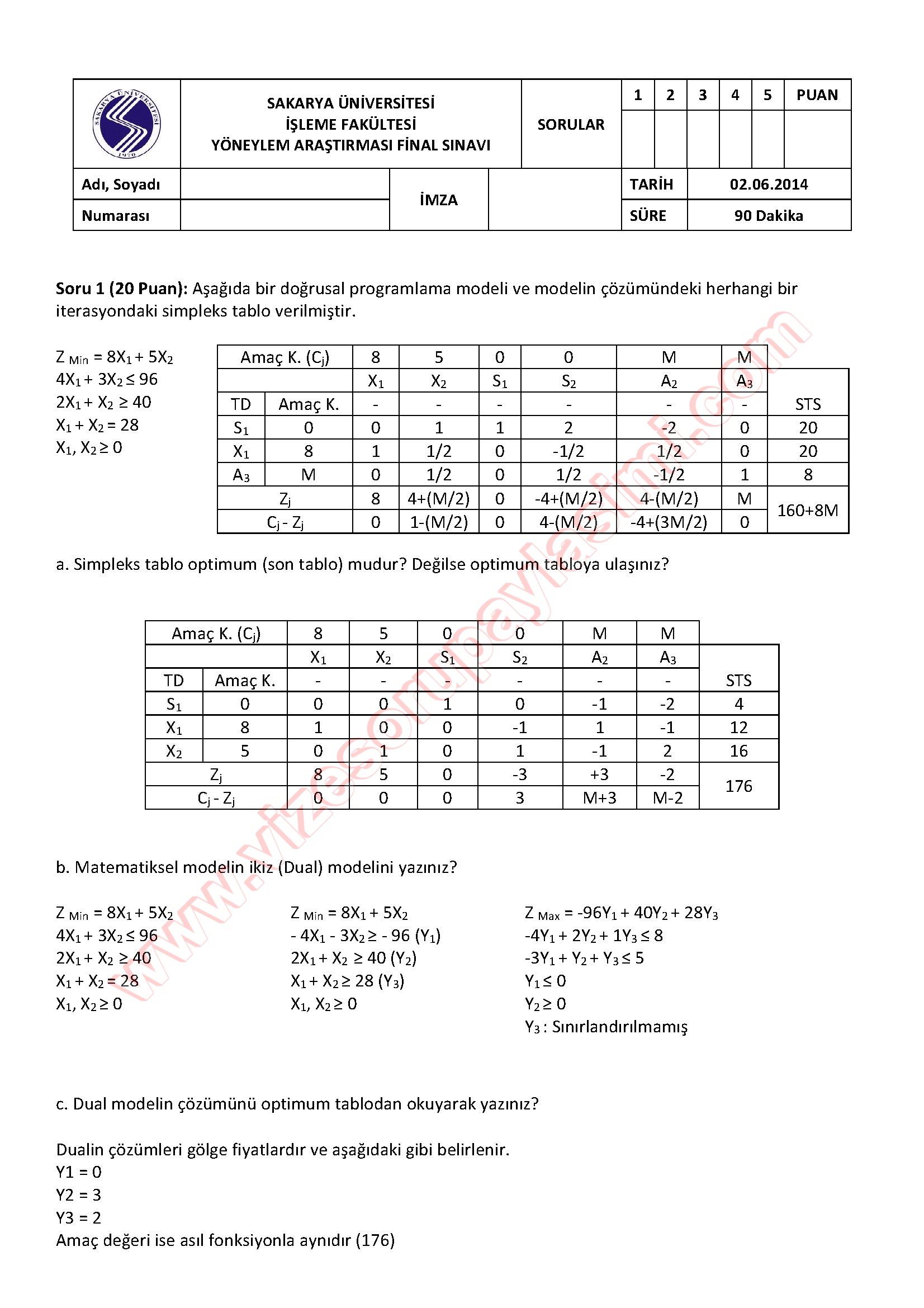 Yöneylem Araştırması Final Soruları Ve Cevapları - 02.06.2014