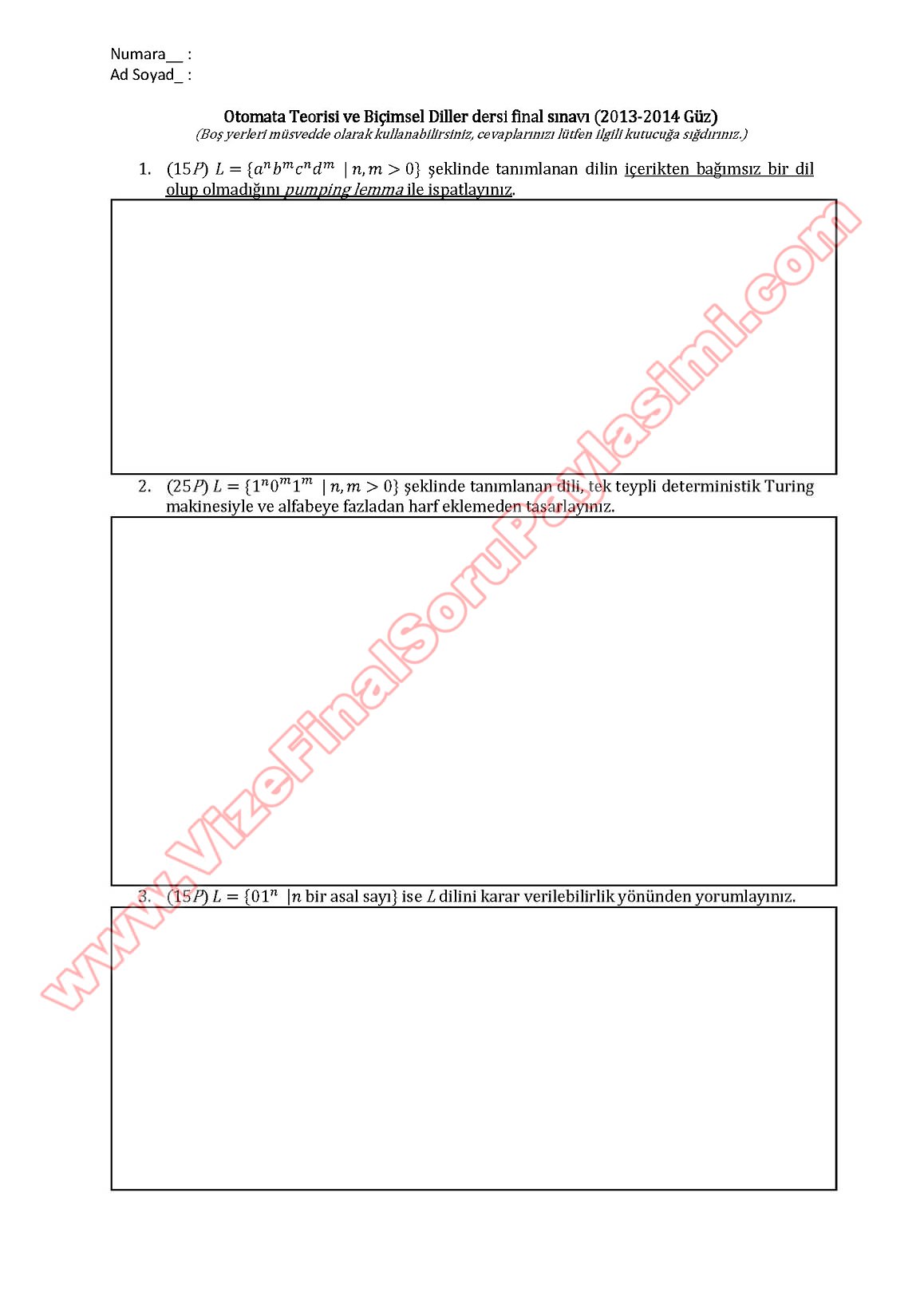 Biçimsel Diller ve Otomata Teorisi Dersi Final Soruları 29-04-2015, 11:32