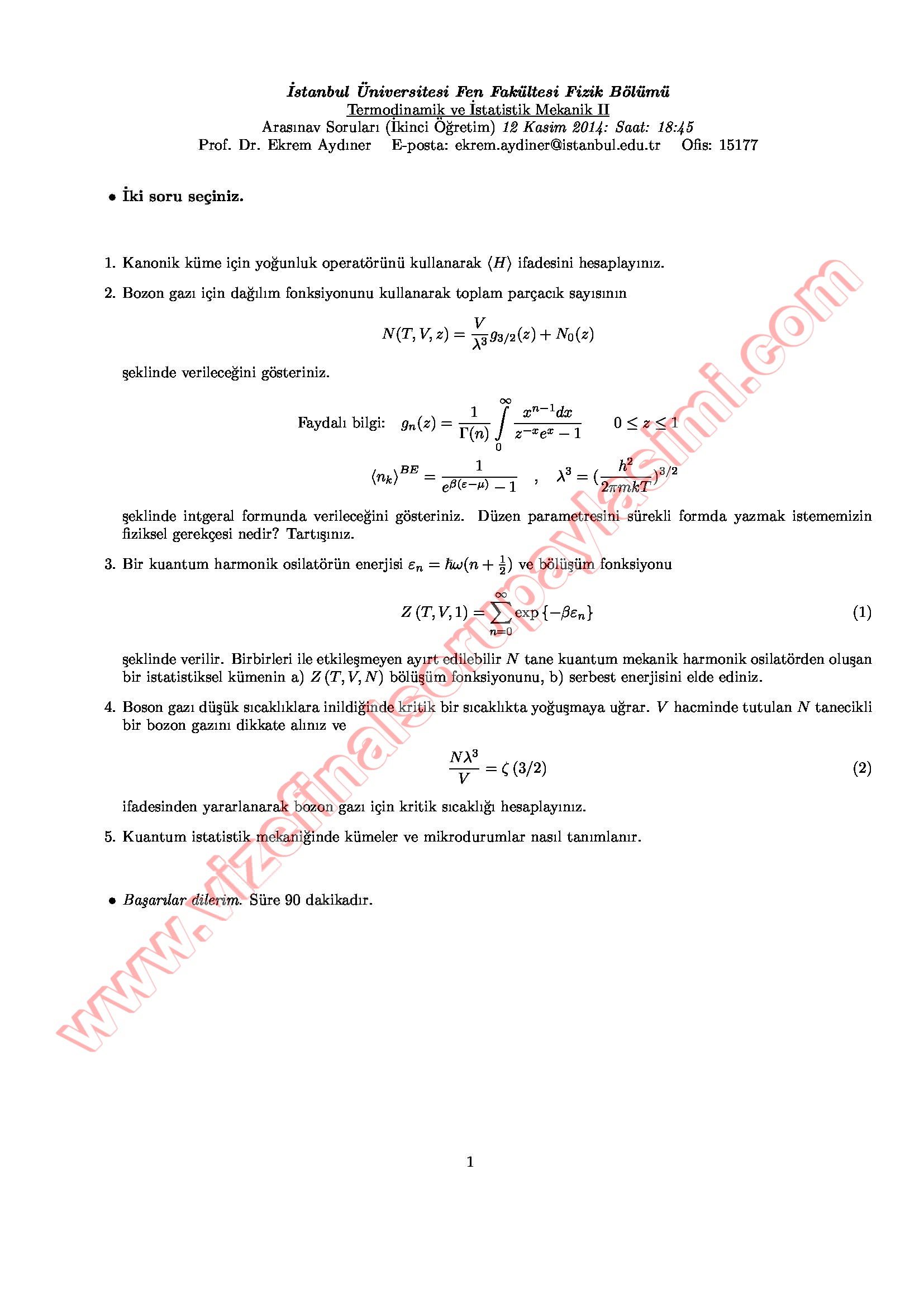 Vize ve Final Soruları / İstanbul Üniversitesi / Termodinamik Ve İstatistik Mekanik-2