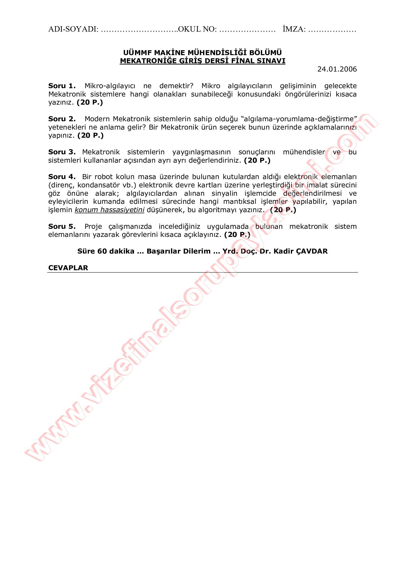 Vize ve Final Soruları / Uludağ Üniversitesi / Mekatroniğe Giriş Dersi