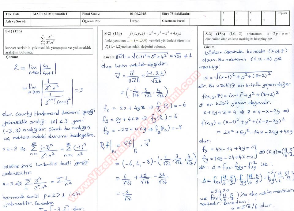 Matematik -2 Final Soruları (Tek. Fakültesi) - 2015