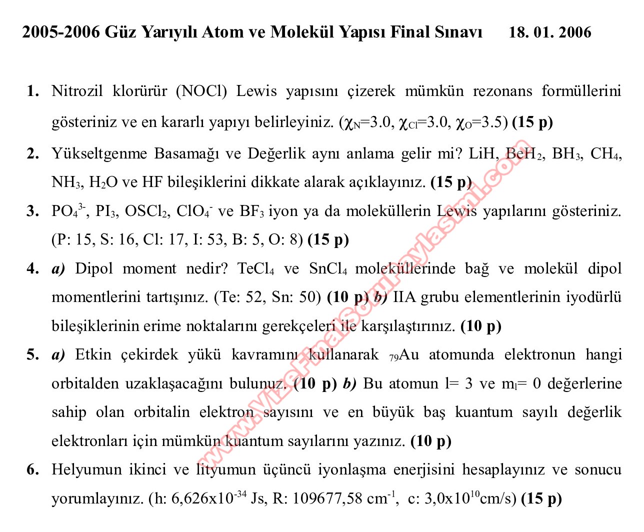 Atom ve Molekül Yapısı Final Soruları 6-06-2015, 17:19