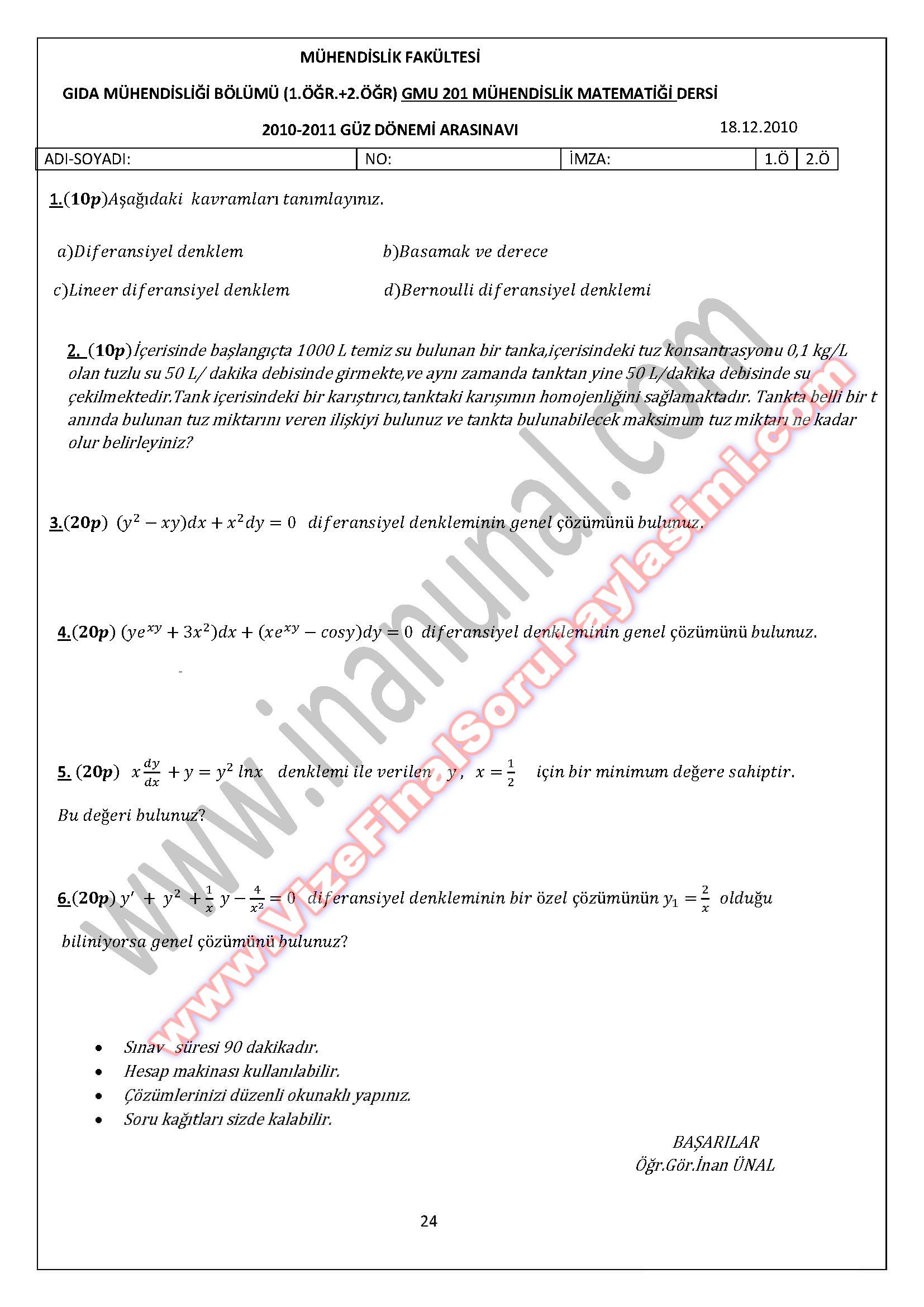 Mühendislik Matematiği Diferansiyel Denklemler Vize Soruları - 18.12.2010