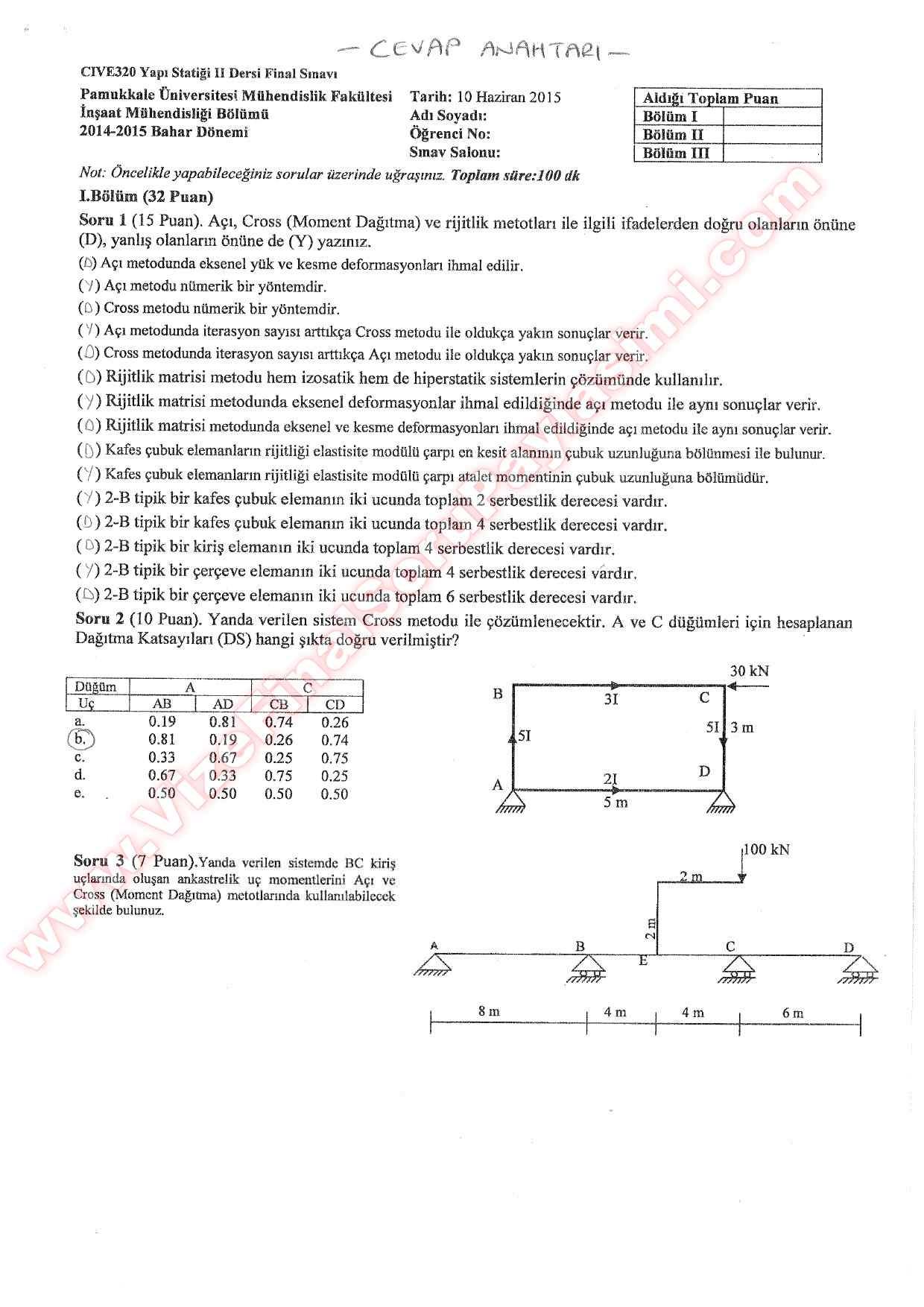 Yapı Statiği 2 Final Soruları Ve Cevapları 2015