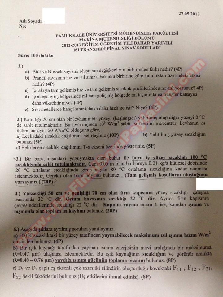 Vize ve Final Soruları / Pamukkale Üniversitesi / Isı Transferi Dersi