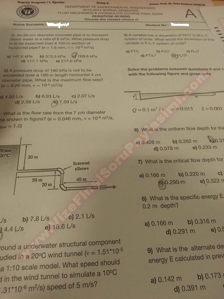 Vize ve Final Soruları / Kocaeli Üniversitesi / Hidrorik Dersi