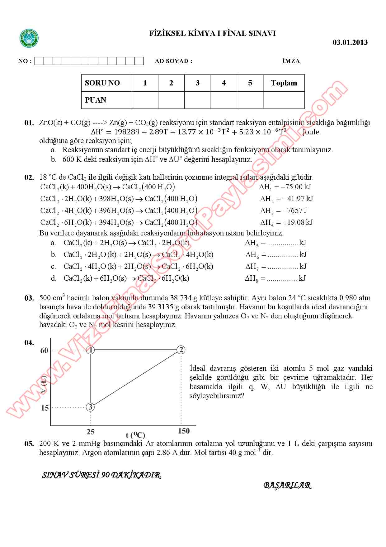 Fiziksel Kimya -1 Final Soruları ve Çözümleri -2013