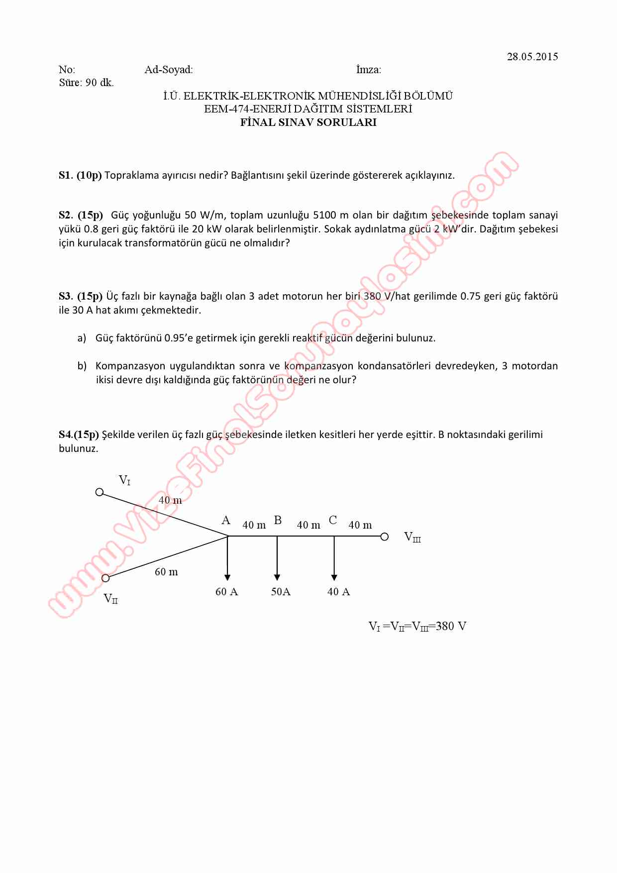 Enerji Dağıtım Sistemleri Dersi Final Soruları ve Cevapları - 2015