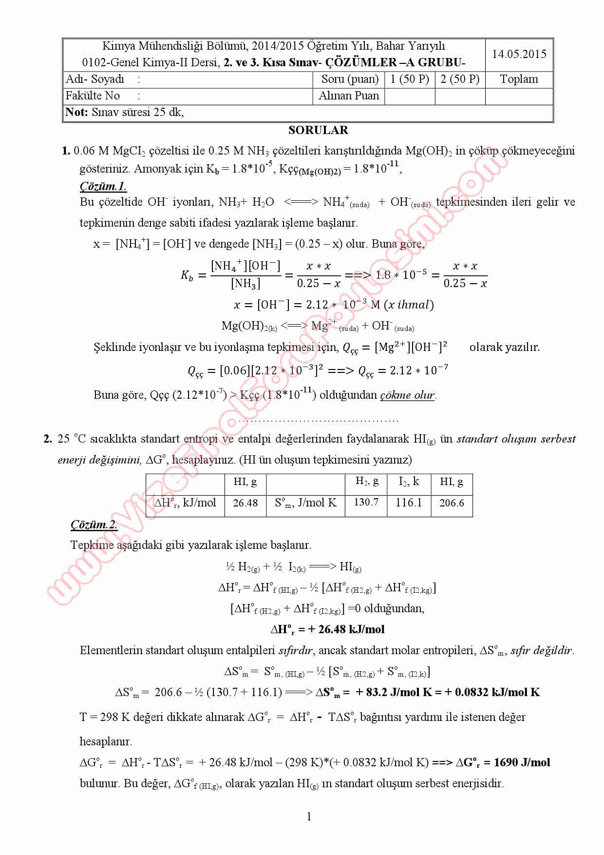 Genel Kimya -2 1.Kısa Sınav Soruları ve Çözümleri 1-08-2015, 18:44