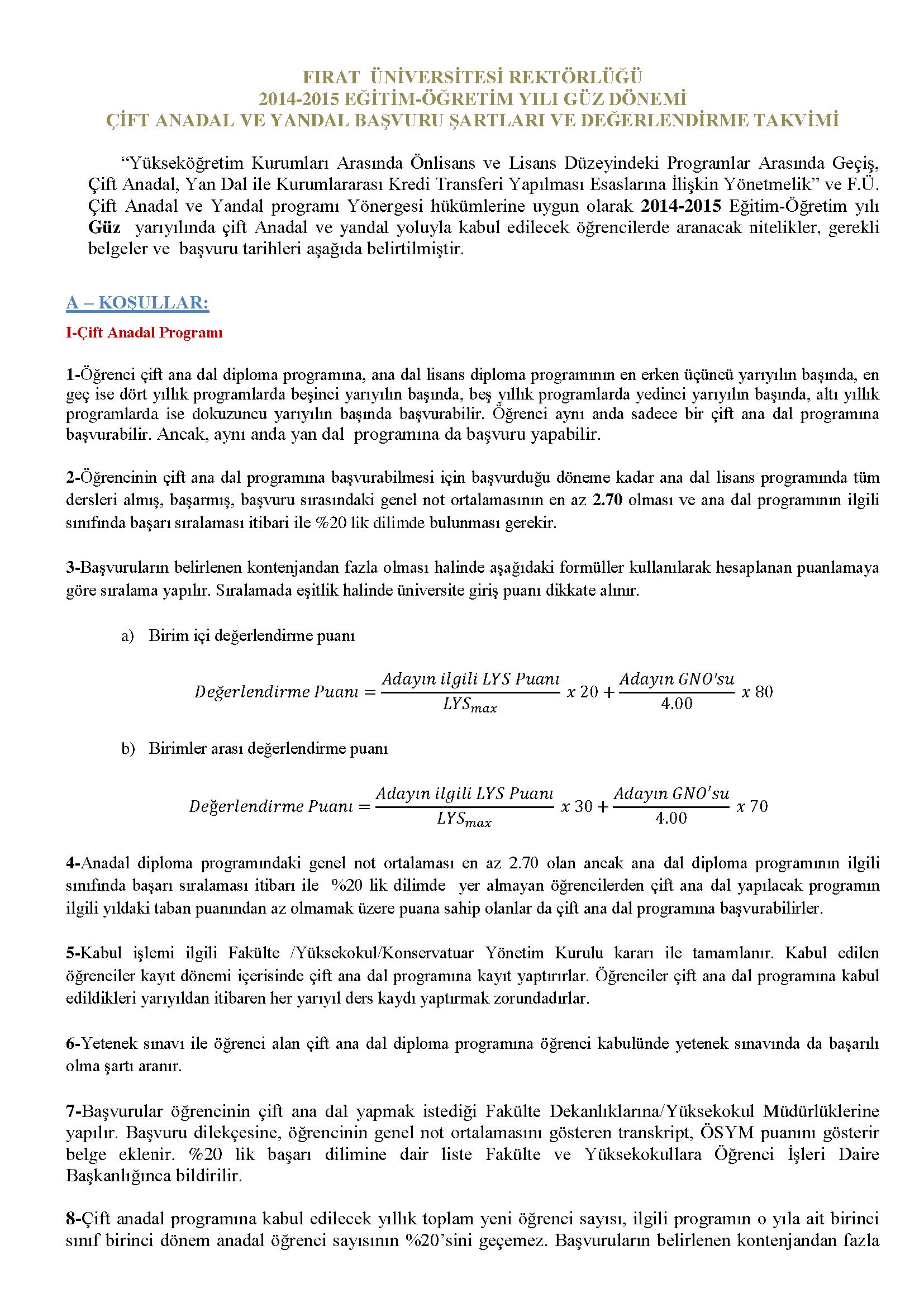2014-2015 Eğitim -Öğretim Yılı Çift Anadal Ve Yan Dal Başvuru Şartları Ve Kontenjanları