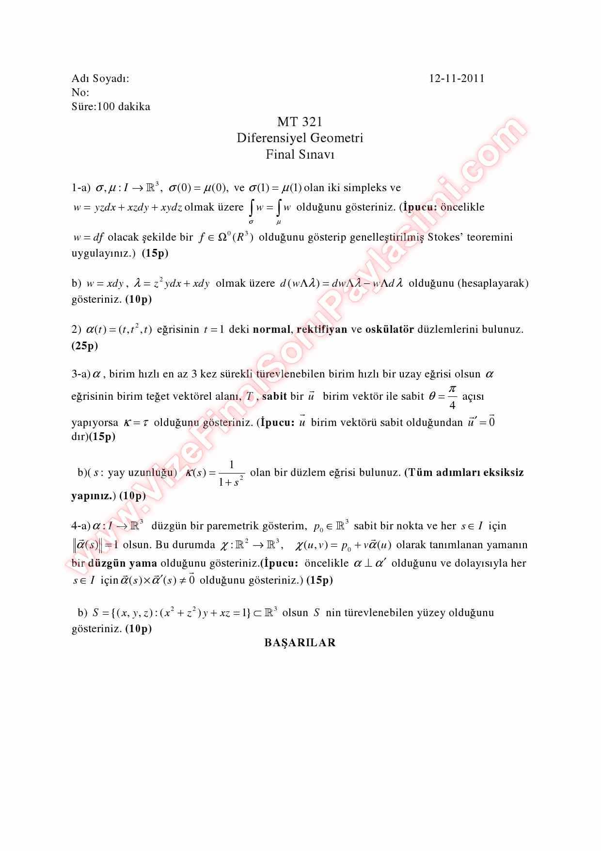 Diferensiyel Geometri final sorulari 2011