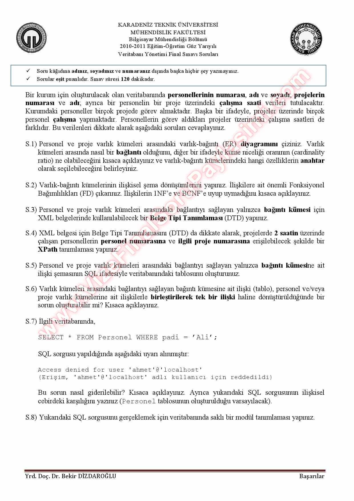 Vize ve Final Soruları / Karadeniz Teknik Üniversitesi / Veritabanı Yönetimi Dersi