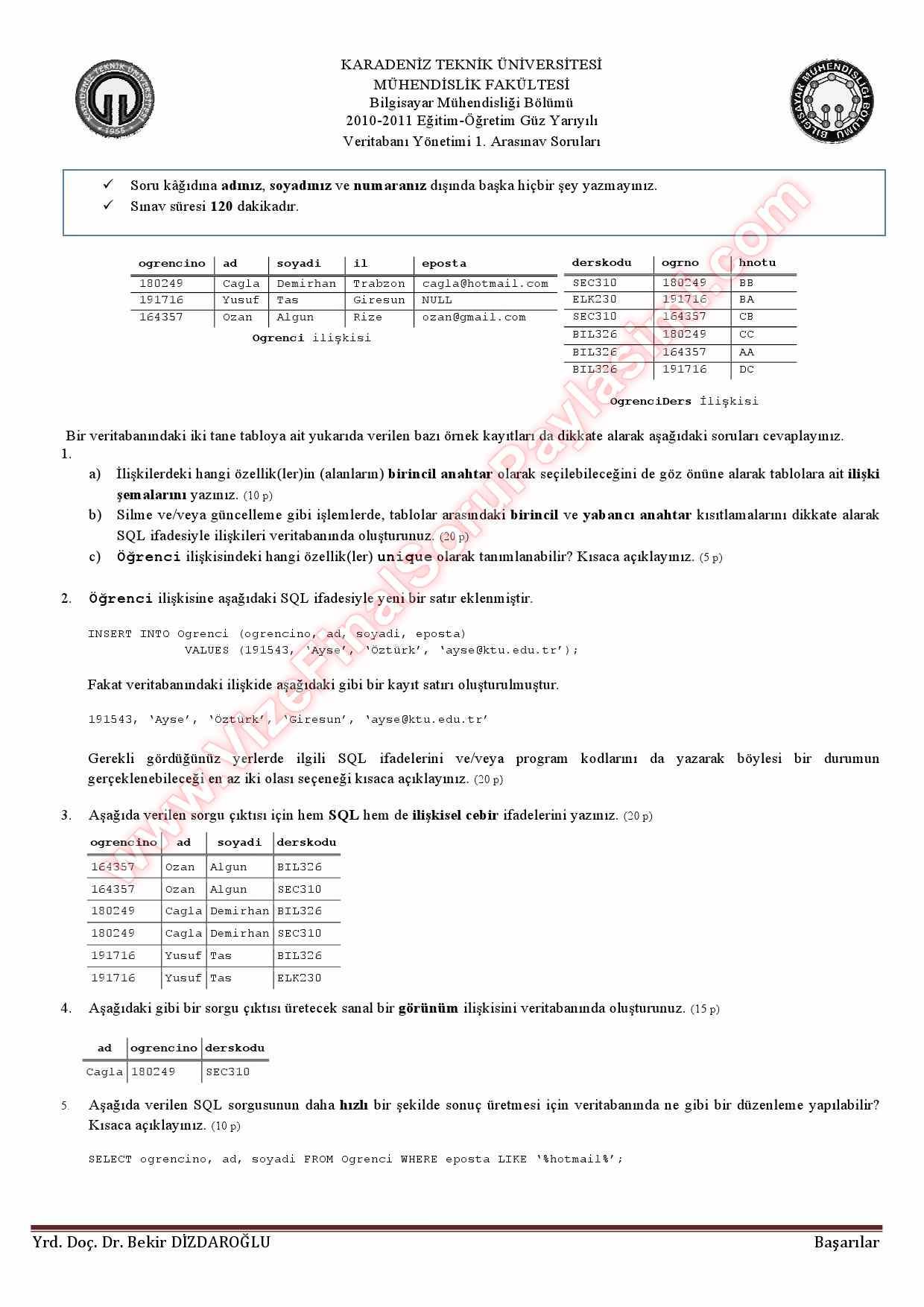 Veritabanı Yönetimi Vize 2 Soruları Ve Çözümleri -2011 4-09-2015, 21:58
