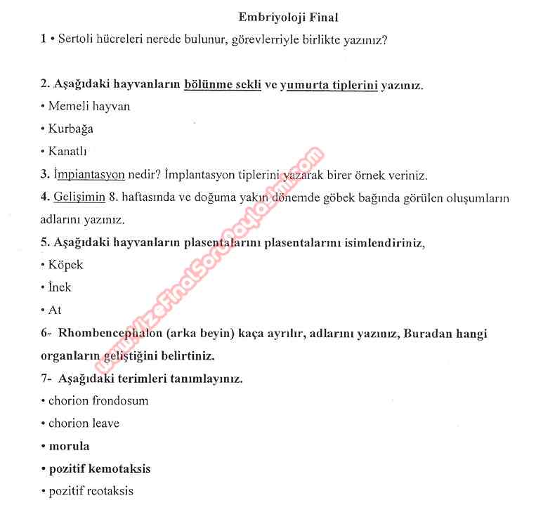 embriyoloji dersi final sorulari fu firat universitesi veterinerlik fakultesi