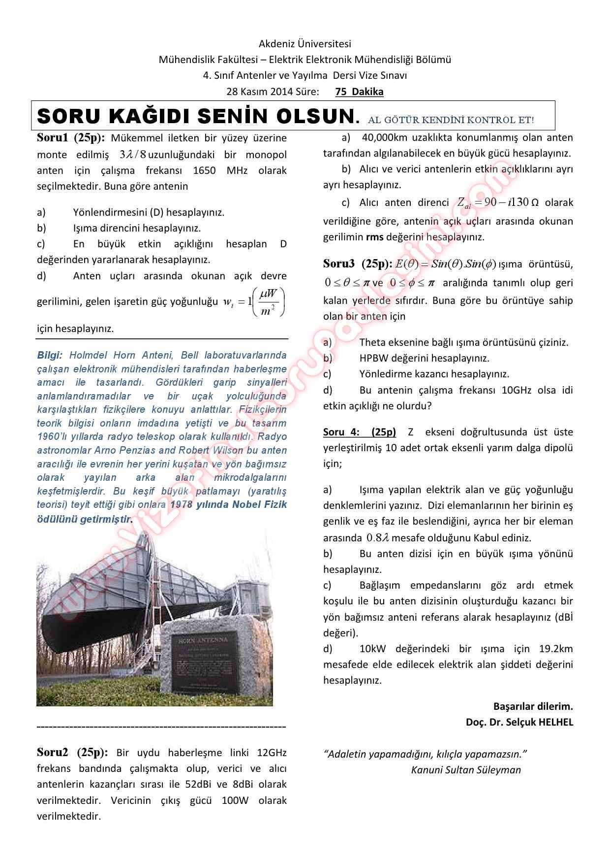 Antenler Ve Yayılma Dersi Vize Soruları Ve Cevapları 2014