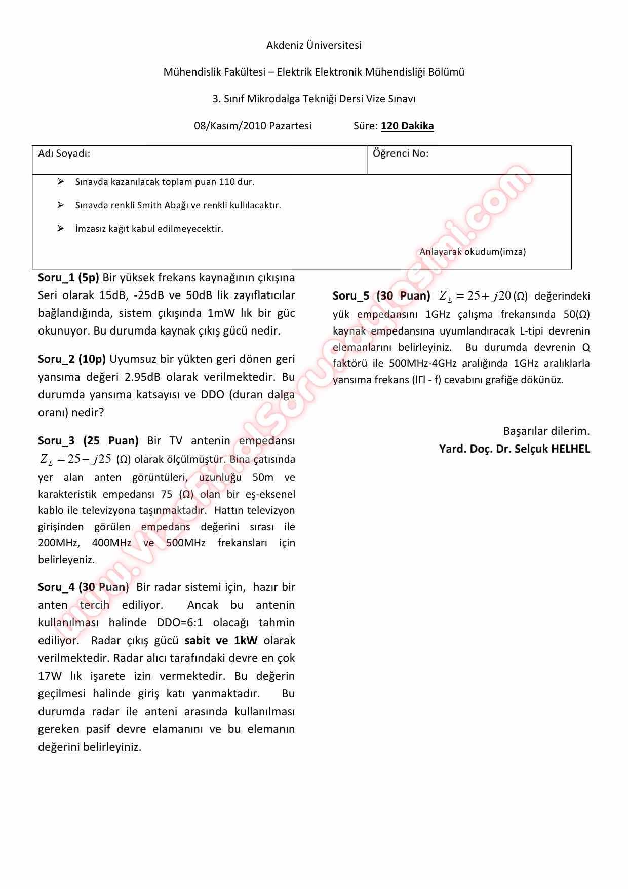 Vize ve Final Soruları / Akdeniz Üniversitesi / Mikrodalga Tekniği Dersi