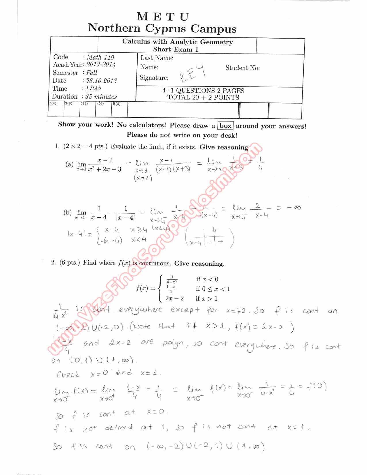 Calculus With Analytic Geometry Short Exam Questions and Solutions Fall 2014 29-10-2015, 04:55
