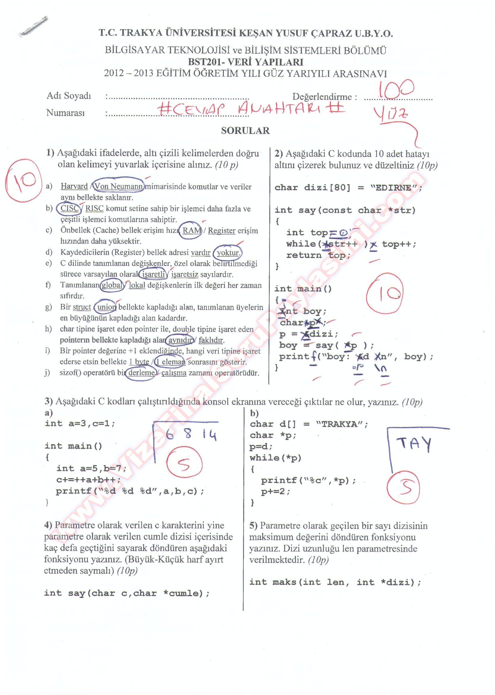 Vize ve Final Soruları / Trakya Üniversitesi / Veri Yapıları Dersi
