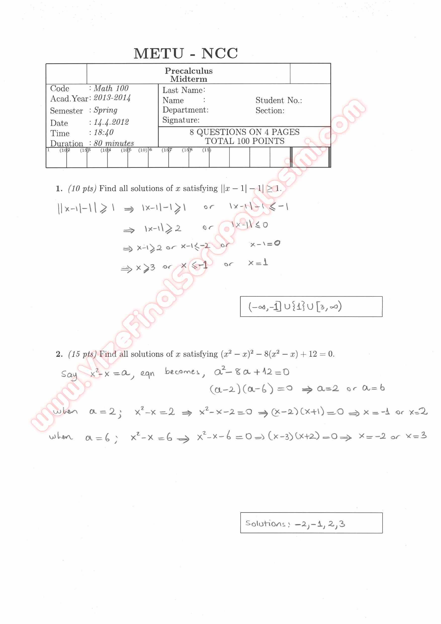Precalculus Midterm Exam Questions Solutions GERİ DÖN-