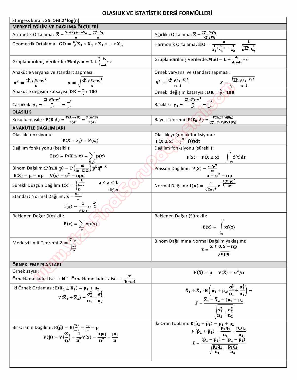 olasilik ve istatistik dersi formulleri formuller GERİ DÖN-