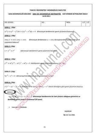 Tunceli Üniversitesi Mühendislik Matematiği Diferansiyel Denklemler Bütünleme Soruları 21-07-2014, 01:55