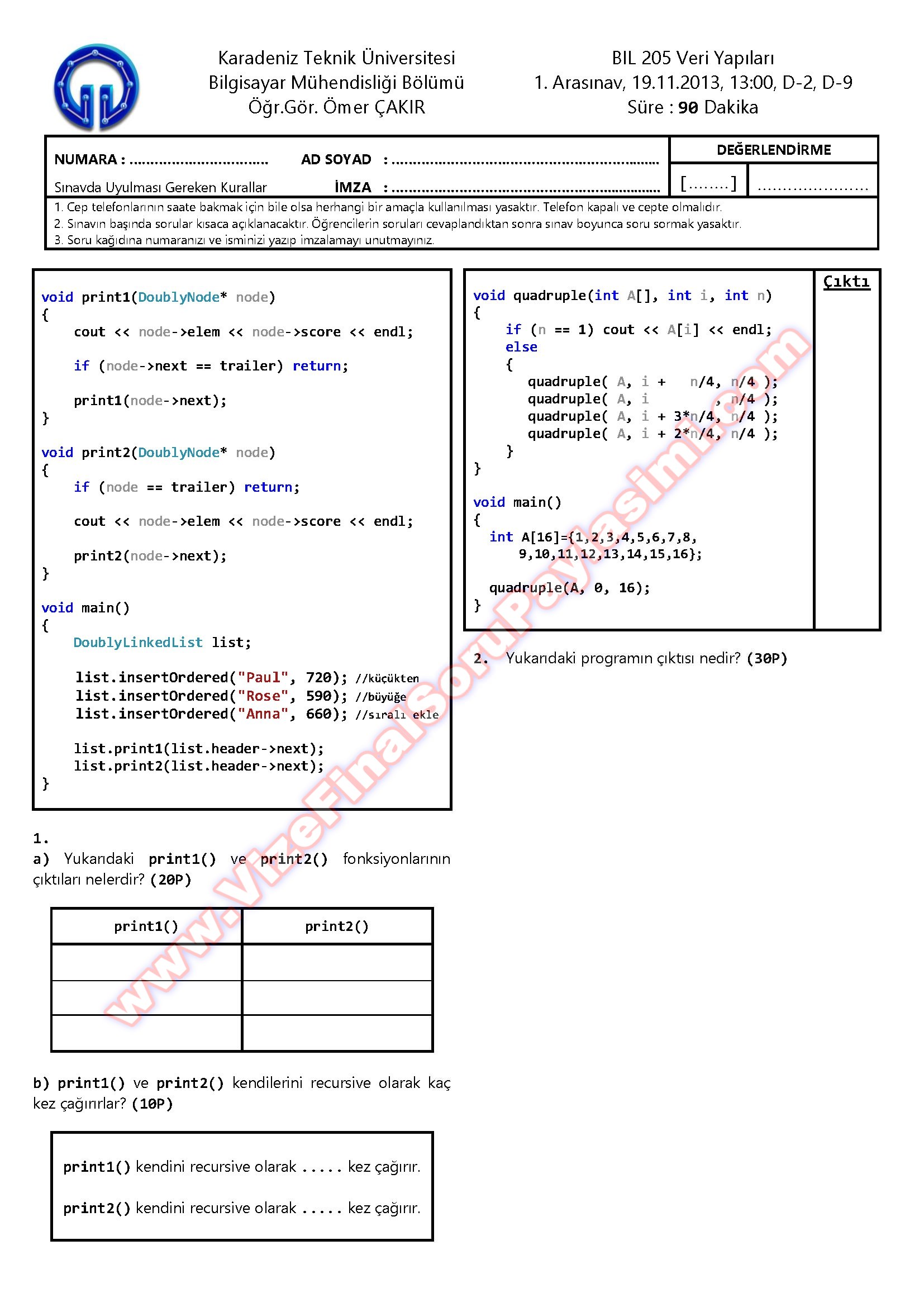 Vize ve Final Soruları / Karadeniz Teknik Üniversitesi / Veri Yapıları Dersi