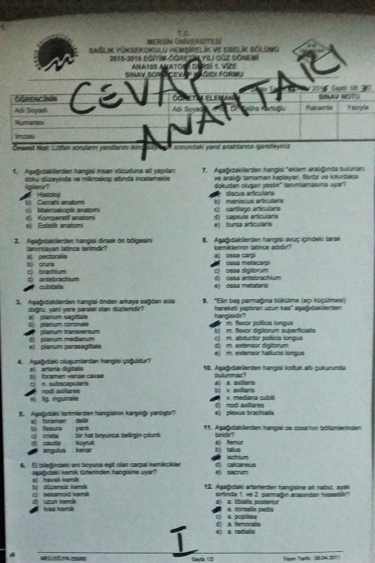 hemşirelik vize soruları anatomi dersi mersin universitesi