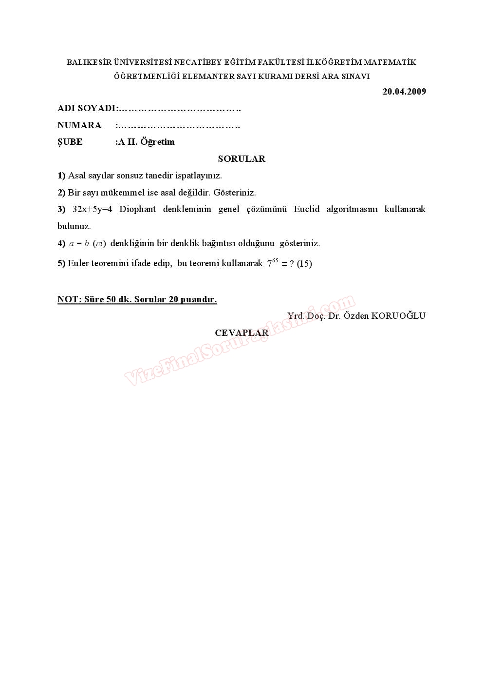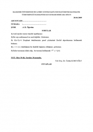 Vize ve Final Soruları / Balıkesir Üniversitesi / Elemanter Sayı Kuramı Dersi