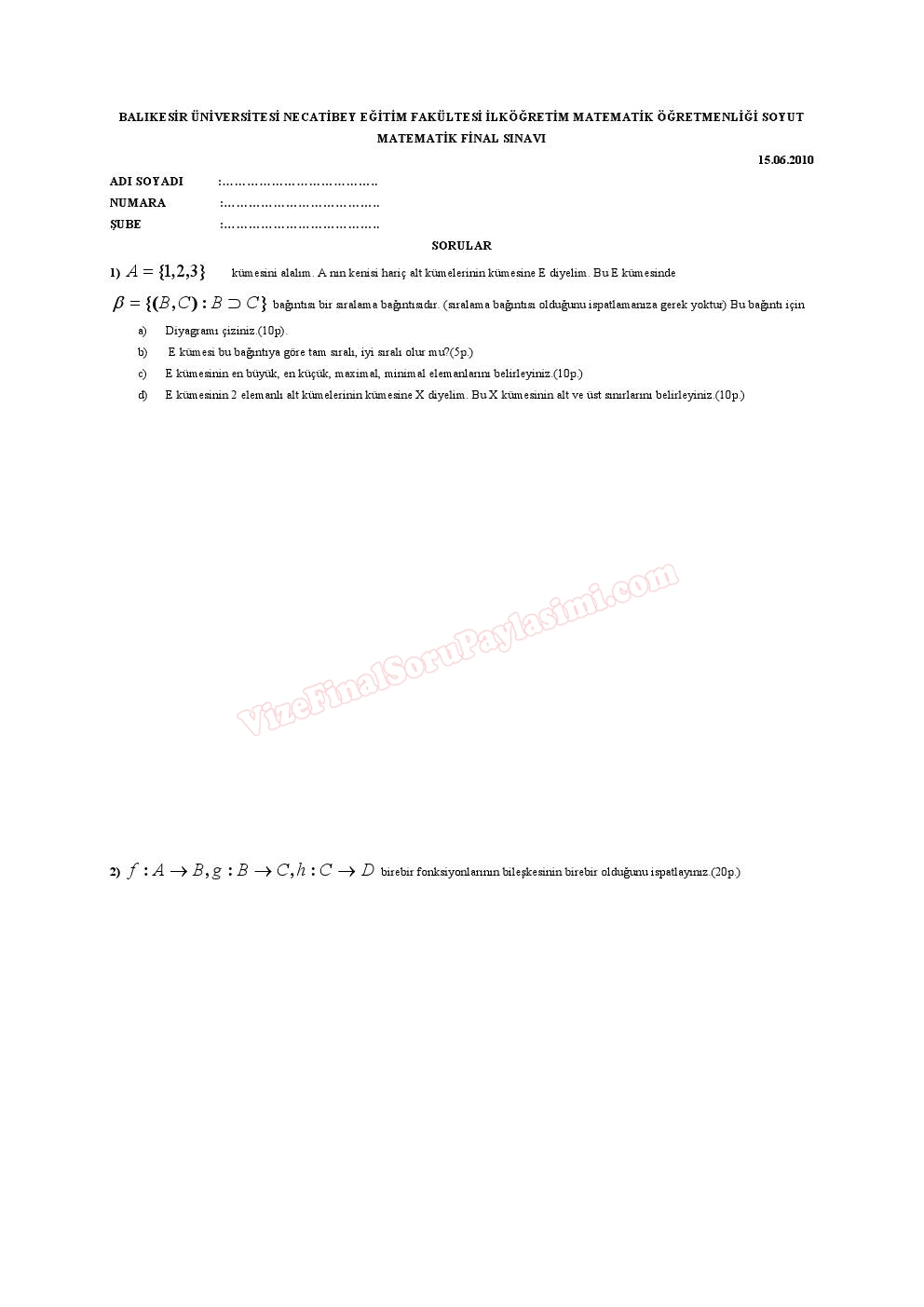 Vize ve Final Soruları / Balıkesir Üniversitesi / Soyut Matematik -1