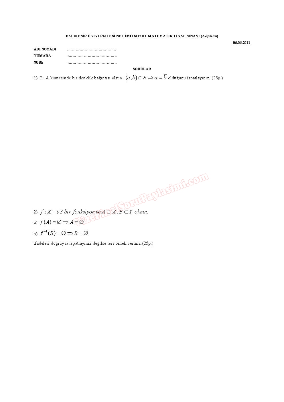 Vize ve Final Soruları / Balıkesir Üniversitesi / Soyut Matematik -1